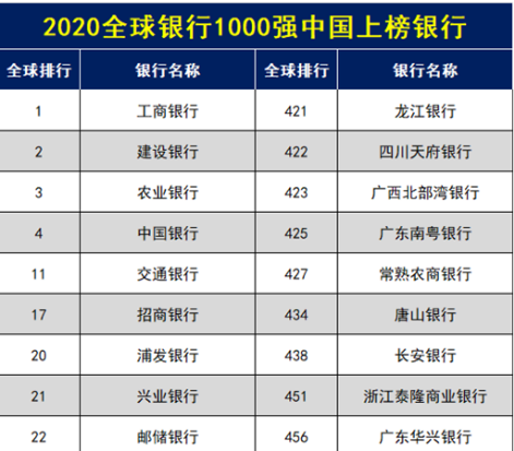 英國(guó)《銀行家》雜志公布了“2020年全球銀行1000強(qiáng)”排行榜,其中中國(guó)工商銀行以3802億美元的一級(jí)資本蟬聯(lián)榜單榜首。