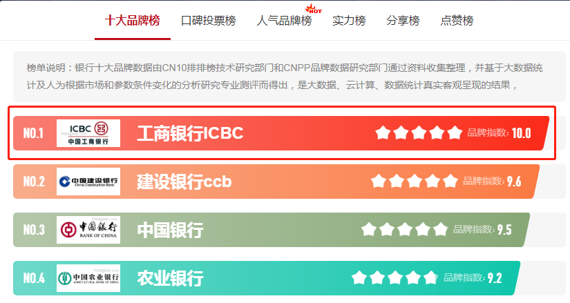 根據(jù)2021年銀行十大品牌榜中榜,中國(guó)工商銀行位居十大品牌數(shù)據(jù)榜首。