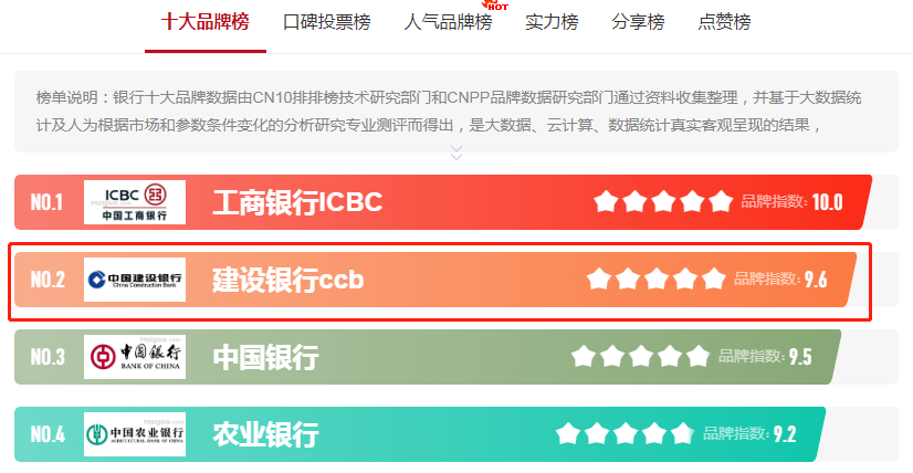 根據2021年銀行十大品牌榜中榜,中國建設銀行銀行排名第二。