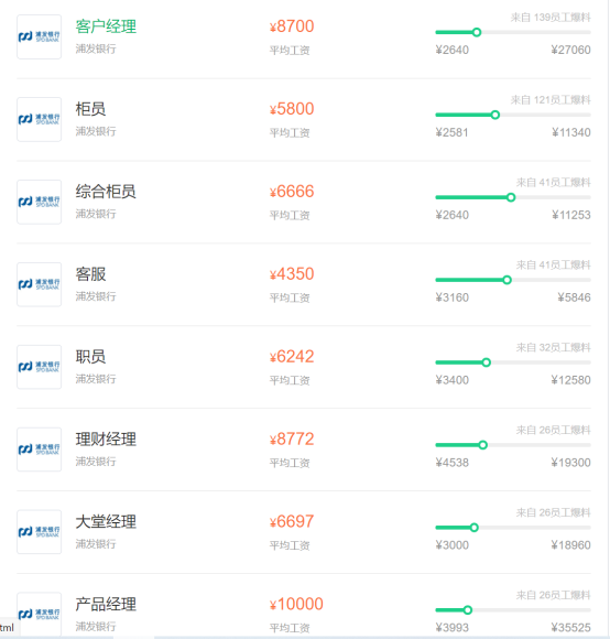 有些崗位會比較舒服,比如總行行政保衛處,總行辦公室等等,一線的操作崗總歸是比較辛苦的,比較柜員,理財經理,客服代表,清算作業崗等,浦發每個月的月薪不高,從4k到15k不等,管理崗和專業技術崗主要就是看年底的風險金和年終獎。
