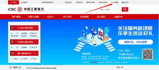 第一步網(wǎng)申報名,按照常規(guī)的操作步驟來說我們可以先進入到工商銀行官網(wǎng)http://www.icbc.com.cn/icbc/,這是第一步然后在官網(wǎng)右上角偏上選擇“人才招聘”。