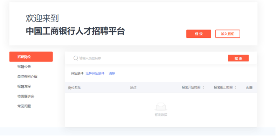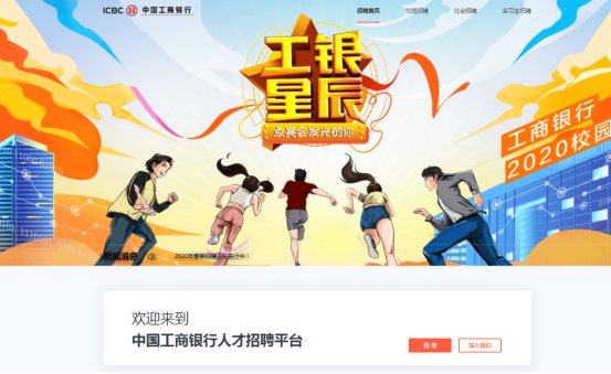 進入“人才招聘”欄目會有各個形式的招聘選擇,選擇“校園招聘”https://job.icbc.com.cn/pc/index.html#/main/home就會顯示到下一步