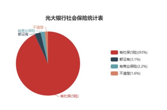 在光大銀行工作的人92%的反饋有社保(5險),2%的反饋有商業保險,2%的反饋都沒有,1%的反饋不清楚,具體見統計圖。