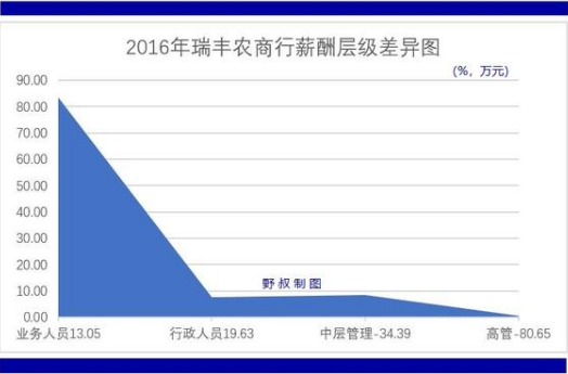 首先,從歷史角度看內部差異。以瑞豐農商銀行2018年1月報送的《首次公開發行股票招股說明書》中的數據為例,2016年該銀行在崗員工1928名(僅包括母公司),人均薪酬15.76萬元;其中,1607名業務人員人均13.05萬元,145名行政人員人均19.63萬元,176名管理人員人均37.28萬元。