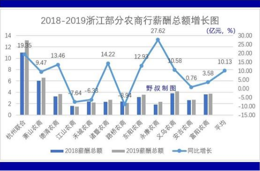 浙江這13家農商銀行中,2019年12家(不含瑞豐農商銀行)的薪酬總額合計約48.38億元,同比增長約10.13%;這一數值小于同期浙江11家城商銀行薪酬總額平均增長18.88%的數值,而與同期浙江農信系統利潤總額同比增長10.69%的數值接近(相關詳情見本文附圖三)。看來薪酬還是隨著利潤同步上漲的。