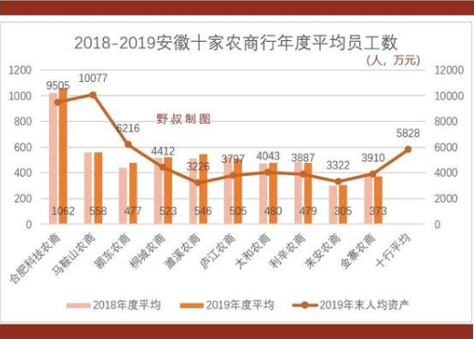 第一,人均管理資產。2019年末,10家樣本機構合計總資產3137.5億元,加權人均資產5828萬元。其中,人均管理資產最多的是馬鞍山農商銀行10077萬元,其次是合肥科技農商銀行9505萬元,