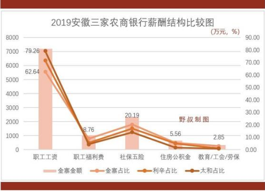 首先,看金寨農商銀行,職工工資占薪酬總額的62.64%,而職工福利費和“五險一金”分別占比8.76%和25.75%。其次,看太和農商銀行,職工工資占比79.26%,而職工福利費和“五險一金”分別占比4.28%和15.64%。利辛農商銀行的相關項目占比介于上述兩家之間,本文不做深述(相關詳情見本文附圖五)。
