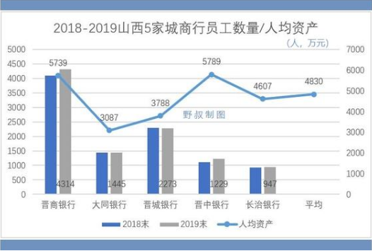 第一,人均管理資產(chǎn)情況。2019年末,上述5家樣本城商銀行總資產(chǎn)合計(jì)4930.47億元,加權(quán)人均資產(chǎn)4830萬(wàn)元。其中,人均資產(chǎn)最多的是晉中銀行5789萬(wàn)元,最少的是大同銀行3087萬(wàn)元。在5家機(jī)構(gòu)之外,2018年末陽(yáng)泉市商業(yè)銀行總資產(chǎn)457.81億元,人均管理資產(chǎn)約6864萬(wàn)元。