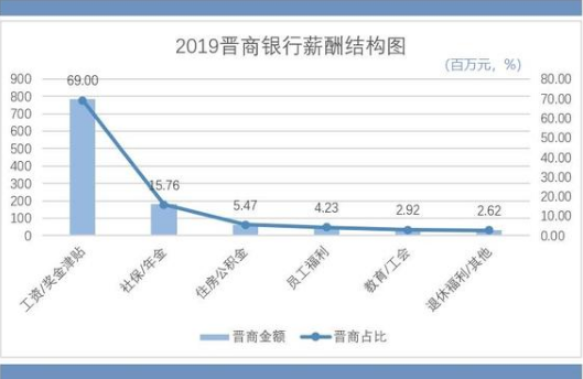 從結(jié)構(gòu)看。由于信息披露詳細(xì)程度不一,本文僅以上市機(jī)構(gòu)晉商銀行為例進(jìn)行分析。2019年度,晉商銀行開(kāi)支工資、獎(jiǎng)金、津貼等薪資類(lèi)薪酬7.86億元,占薪酬總額的69.0%;而“五險(xiǎn)一金”合計(jì)占比21.23%,職工福利占比4.23%(相關(guān)詳情見(jiàn)本文附圖五)。與其他各類(lèi)銀行相比,這一結(jié)構(gòu)具有薪資、保障、福利相對(duì)均衡的特征。