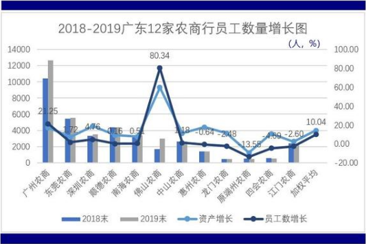 從年度增長看,2019年度員工數量增長最高的是佛山農商銀行,由上年末的1668人增加至2019年末的3008人,增幅80.34%;這與其同期總資產同比增長59.56%相對應。增幅最低的是原端州農商銀行-13.55%,這與該銀行當年進行合并有關。一般機構在合并時期人事上均會凍結編制、“只退不進”。