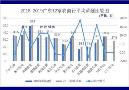 與同期其他省份農商銀行(樣本機構)平均薪酬相比,廣東12家機構的數值處于中上水平。例如,在其上的是,同期貴州農信6家樣本農商銀行(主要集中在相對發達的貴陽地區)加權平均薪酬38.9萬元;