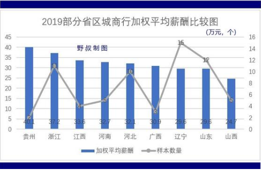 相對較高的例如,2019年度貴州2家城商銀行加權平均薪酬40.1萬元,浙江11家城商銀行加權平均薪酬37.2萬元,江西4家城商銀行加權平均薪酬為33.6萬元。