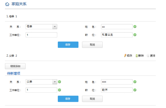 家庭關(guān)系中如實填寫即可,經(jīng)常遇到一個問題是父母是經(jīng)營小型店面的,應該如何寫?一般工作單位就是令尊令堂店鋪名字,職務就是個體經(jīng)營戶戶主。