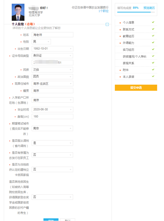 這里需要說明的一點是往往很多項空著的導(dǎo)致最后完整度不是百分之百,這個無需擔心,把你有的都填上即可,盡量人為的讓簡歷完整度高點。