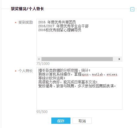 不過還是有很多同學“獲獎經(jīng)歷”空著,因為很多佛系同學有關(guān)獎勵方面的活動、賽事的基本上都沒有參加過,所以這里只好空著;但是很多同學往往忽略了一個可以填寫的獎項那就是團體獲獎經(jīng)歷,一般情況下很多班級活動或者社團活動作為參與者這些獎項也是有同學的一份功勞的,所以同學所參加的團體有過獲獎經(jīng)歷時這個也是可以填寫的;先不談獎項質(zhì)量高低,這里至少沒有空著簡歷完整度也高了。