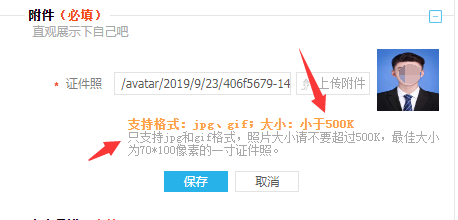 證件照要求一寸免冠,大小在500k以內(nèi),尺寸為70*100,保存后起初就會顯示照片