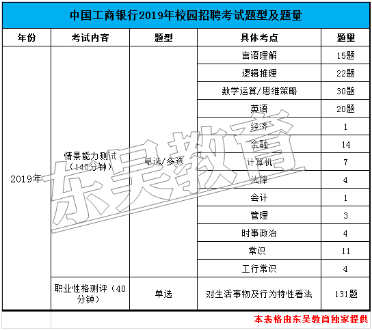 從上圖可以看出中國工商銀行筆試考EPI、英語、專業、綜合以及性格測試等題,機考,且為選擇題;其中數學運算和思維策略占比是最多的,大家在備考筆試時一定要認真備考這個模塊;性格測試題量在131道題左右,性格測試不算入筆試成績,大家在做題時按照平常正常的思路來做,同樣的題目不要選擇不同答案;
