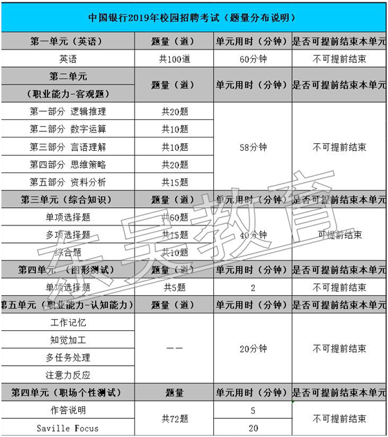 1.中國銀行筆試難度基本都是偏大的,考察內容也比較多:EPI、專業知識、計算機、時事政治、英語、認知能力測試、性格測試等等,時長基本在2.5-3.5小時,平均47秒-52秒就要做完一道題,所以每年絕大多數同學題目都是無法做完的。具體如下圖