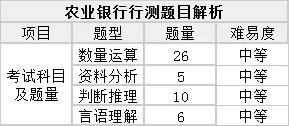 從往年的筆試考情來看,農(nóng)行的行測主要考察的是數(shù)量運算、資料分析、判斷推理和言語理解。難度中等,從題量上來看,數(shù)量預(yù)算占比較多。