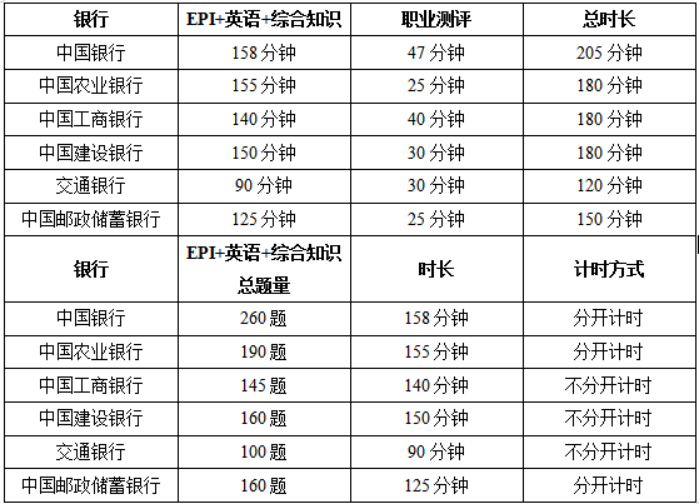 銀行考試筆試時間幾個小時銀行筆試主要考察EPI、英語、綜合知識、職業測評,筆試題型以單選題和多選題為主,各大行在筆試時長、總題量和計時方式上都有所區別。以六大行為例,筆試時間在3個小時左右。下面是2018年秋招中六大行的筆試時長、題量以及計時方式,考生們可以參考一下。