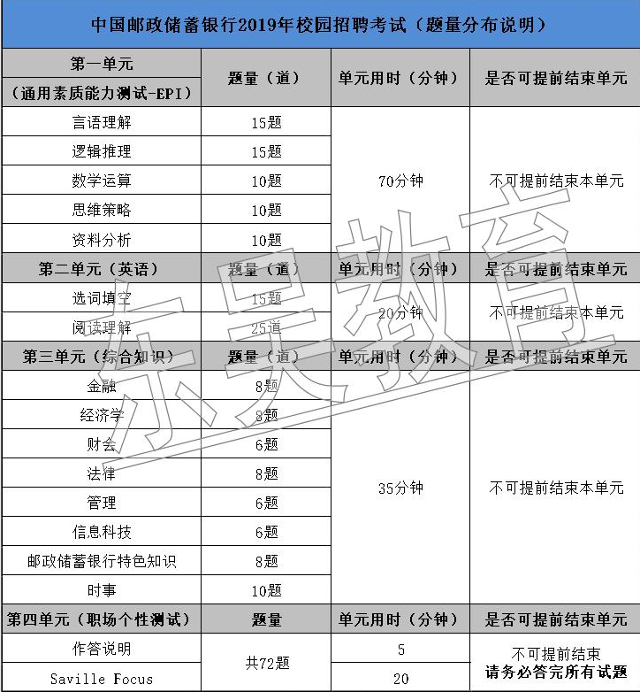 1.郵儲銀行的考試科目主要是:通用素質能力測試(EPI)、綜合知識、外語、性格測試。