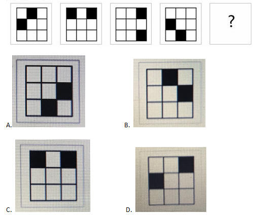 2、學者G也拿出一個方格的游戲,看大家誰能做的出來。根據前四幅圖片的規律,你能選出問號處的正確圖片嗎?( )