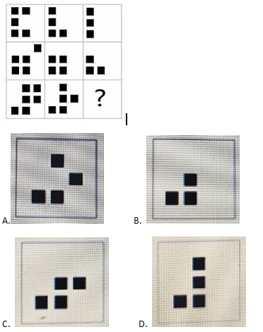 【東吳教育解析】此題考查的是元素的分布,每一行第一個圖形開始,從右往左,從上往下,依次減少一個黑色方塊,第二行第三行按照同樣的規律,第三行第二個圖形,右邊減少一個黑色方塊之后,是D選項,因此正確答案選D。