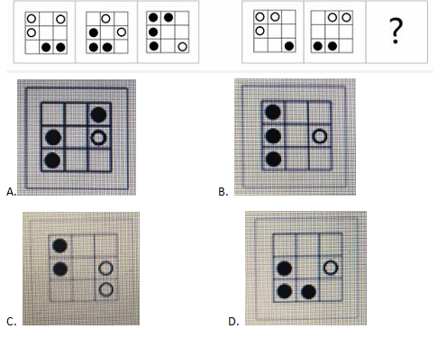 3、學者H在玩一個看似很難的黑白棋的游戲。你要從前三幅圖片中,找到游戲規律,然后在問號處選出正確的黑白棋的圖案,你就可以獲勝。那么你應該為問號處選擇哪一幅圖案呢?( )