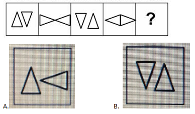 【東吳教育解析】方法一:此題考的是位置關系,間隔觀察,第一幅圖里的兩個三角形左右對調(或者理解為翻轉)得第三幅圖,第二幅圖也是此規律得第四幅圖,問號處,應該是第三幅圖按照此規律,兩個三角形左右對調,則C項符合,因此,正確答案選C。