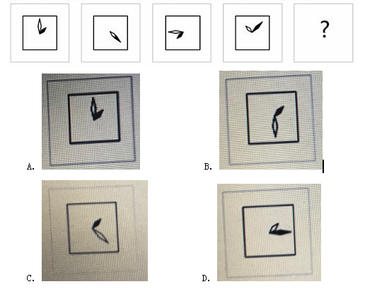 2、學者K在做一個有趣的統計,每經過一段時間,他會把手表上的時間畫在紙上。畫了四幅圖以后,大家發現了其中的規律。你是否也發現了呢?請為問號處,選出正確的第五幅時間圖吧。( )