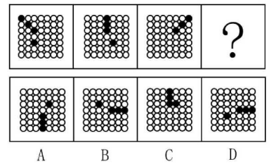 【東吳教育解析】題干連著的三個黑點分別在對角線上、豎直對稱軸上、對角線上、(水平對稱軸上),單獨的那個黑點在最中間的那個九宮格里面每次逆時針走兩格,綜合起來,答案選B。