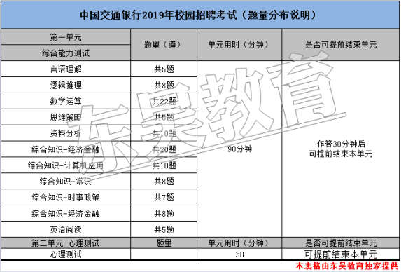 2021交通銀行校園招聘考試內(nèi)容暫未公布,根據(jù)往年情況,交通銀行校園招聘筆試內(nèi)容科目分為:通用素質(zhì)能力測(cè)試(EPI)、綜合知識(shí)、英語、心理測(cè)試四個(gè)部分。以下是2019交通銀行校園招聘考試內(nèi)容題型題量。