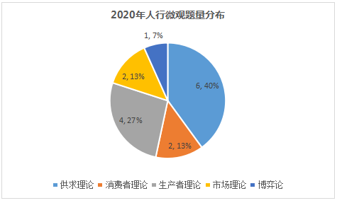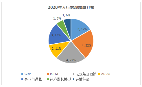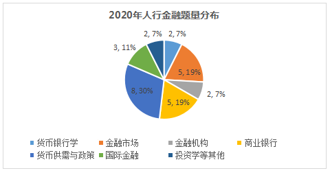(二)金融部分考查內(nèi)容廣泛,主要包括貨幣銀行學(xué)(貨幣、信用、利率、貨幣供需、貨幣政策等)、金融市場(chǎng)學(xué)(貨幣市場(chǎng)、資本市場(chǎng)、衍生品市場(chǎng)等)、金融機(jī)構(gòu)(中央銀行、商業(yè)銀行)、國(guó)際金融(國(guó)際收支、外匯與匯率)、投資學(xué)等。2020年人行考試題量分布如下圖。