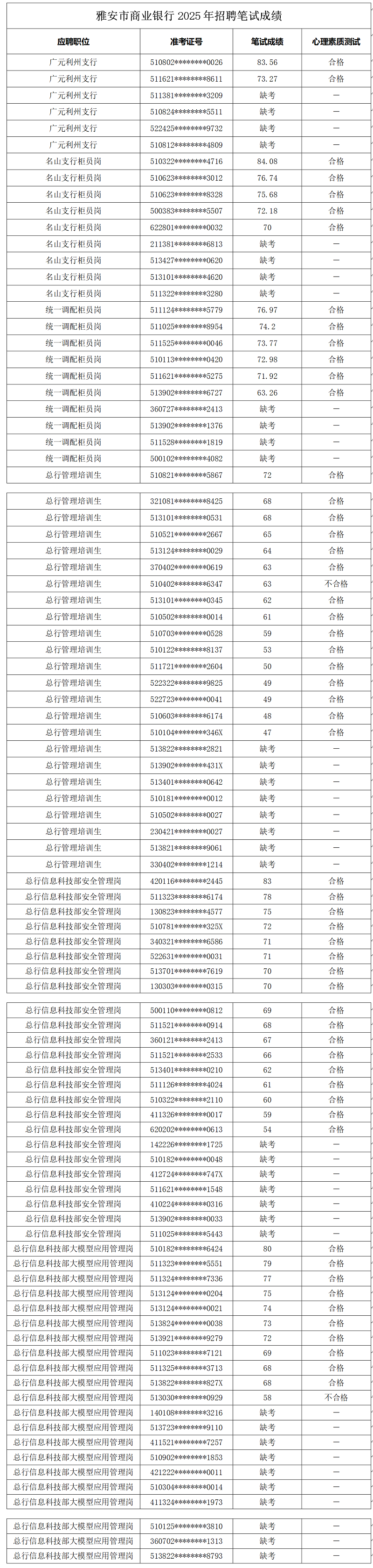 對雅安市商業銀行2025年招聘員工筆試成績(見附件)有疑問的,應于成績公布之日起至2025年8月22日17:00前,向招聘工作人員申請核查。