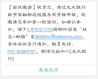 2020年中國光大銀行數(shù)字金融部遠(yuǎn)程服務(wù)崗春季校園招聘第一輪面試通知