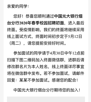 2020光大銀行煙臺分行春季校園招聘終面通知