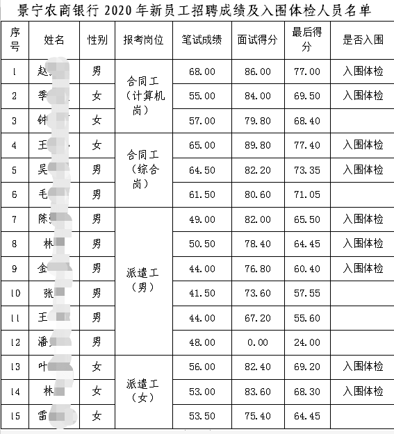 根據《浙江景寧農村商業銀行股份有限公司2020年新員工招聘公告》要求,已完成筆試、面試,現將招聘面試成績、總成績及入圍體檢人員名單進行公示,具體公示事項如下: