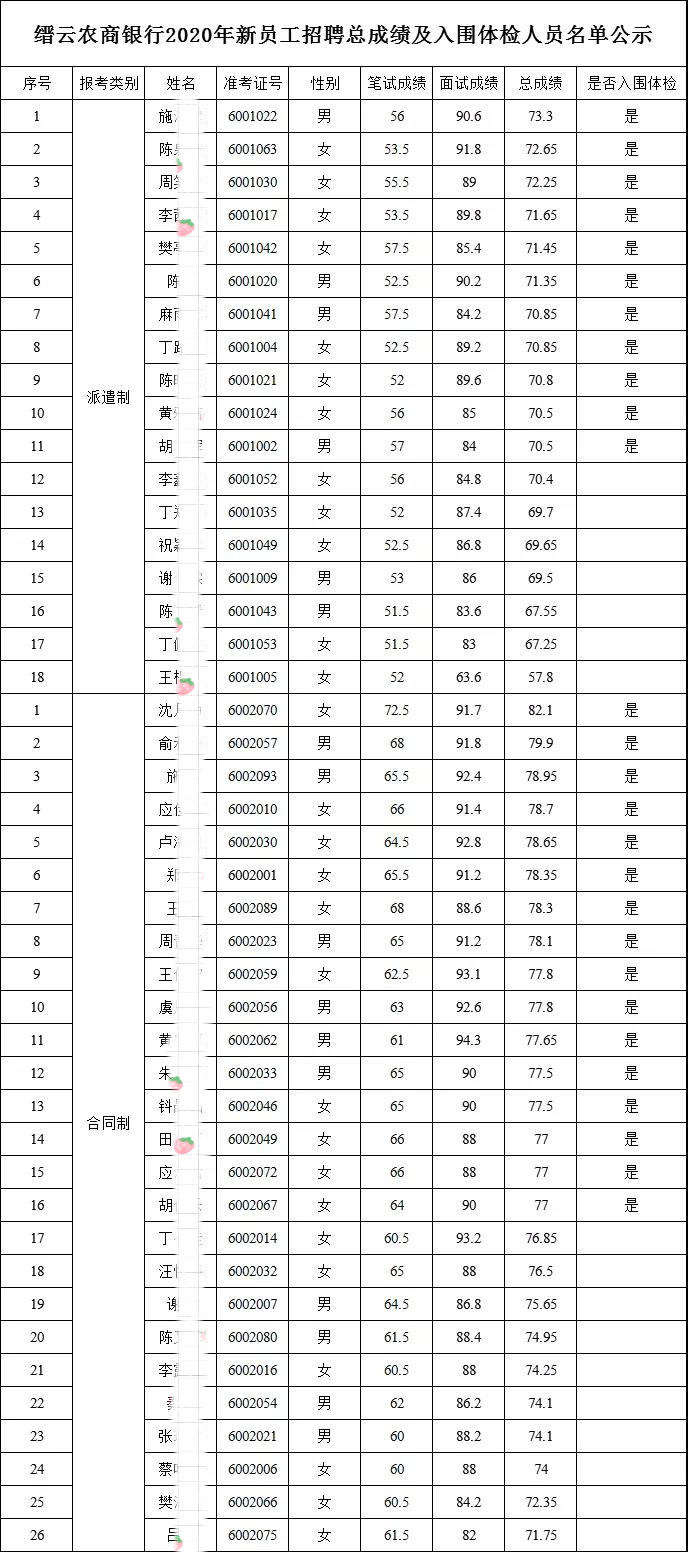 2020年縉云農商銀行新員工招聘總成績及入圍體檢人員名單公示