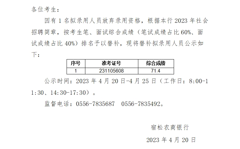 2023宿松農商銀行社會招聘遞補擬錄用人員公示 名單