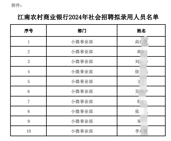 原標(biāo)題:江南農(nóng)村商業(yè)銀行2024年社會招聘擬錄用人員公示