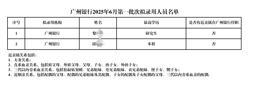 根據廣州銀行2025年社會招聘工作安排,經我單位公開選拔及審批,本批次擬錄用2人,現將人員名單進行公示(名單詳見附件),公示期為5個工作日。