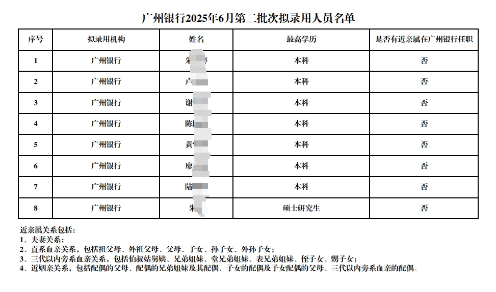 2025年廣州銀行6月第二批次擬錄用人員公示