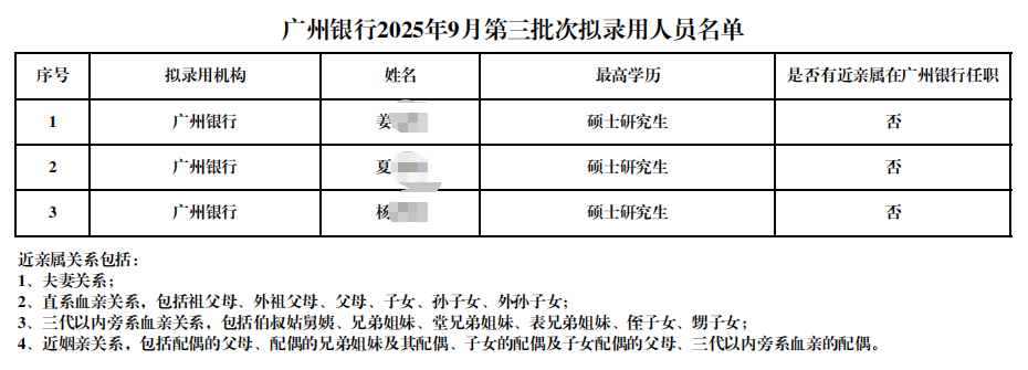 根據廣州銀行2025年社會招聘工作安排,經我單位公開選拔及審批,本批次擬錄用3人,現將人員名單進行公示(名單詳見附件),公示期為5個工作日。