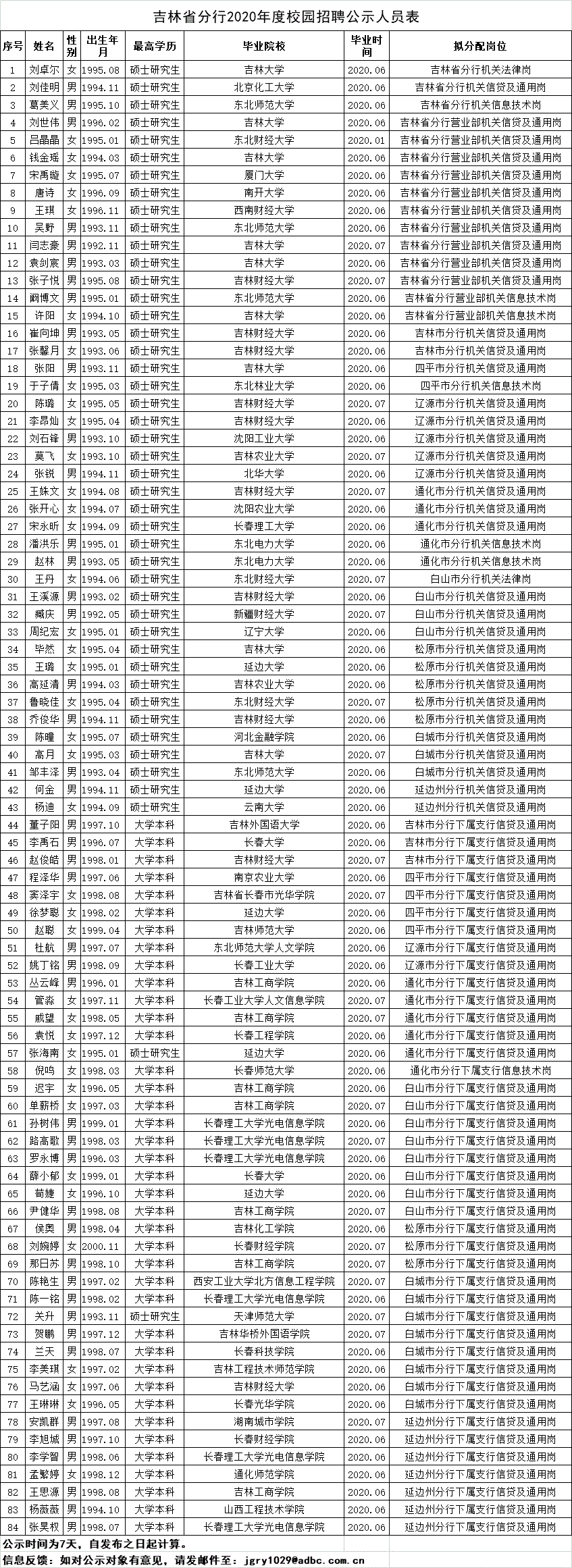 2020中國農業發展銀行吉林分行春季校園招聘結果公示