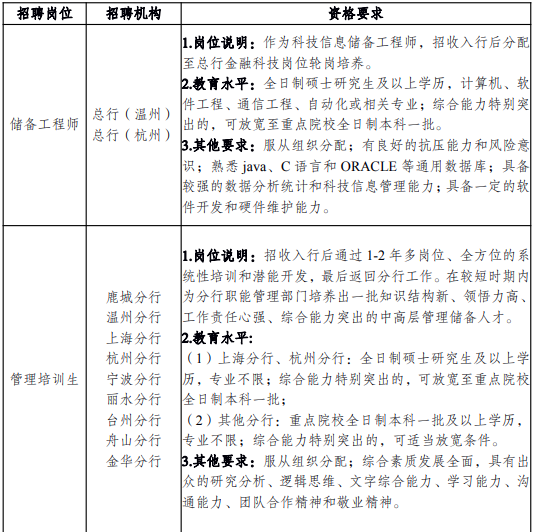 具體報名條件請參考招聘公告,詳見《2020年溫州銀行春季校園招聘公告》。