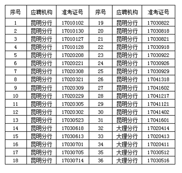 云南紅塔銀行2017年昆明分行、大理分行崗位招聘考試已結束,現將入圍人員名單公告如下: