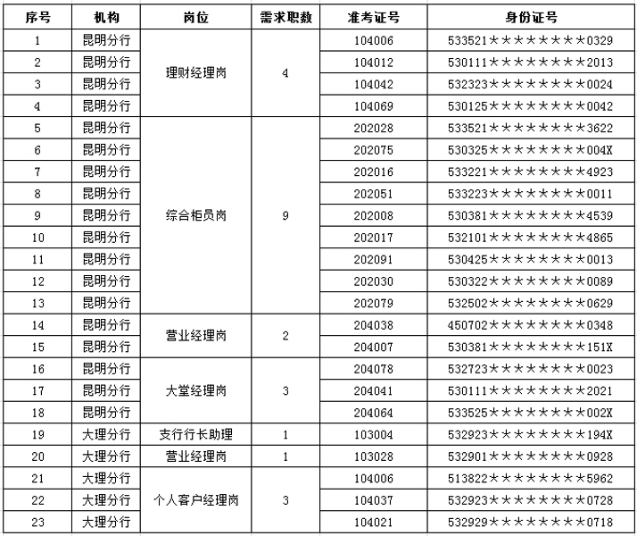 由于大理分行支行行長崗位參考人員綜合成績均未達及格分60分,故本次社會招聘我行取消對大理分行支行行長崗位的招錄,擬錄用以上23人。