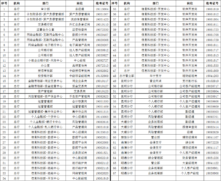 3.根據(jù)招聘實(shí)際情況,對(duì)投資銀行部高級(jí)項(xiàng)目經(jīng)理崗、授信審批部高級(jí)授信審批崗、昆明分行營(yíng)業(yè)網(wǎng)點(diǎn)支行長(zhǎng)3個(gè)崗位進(jìn)行調(diào)整,按中級(jí)項(xiàng)目經(jīng)理崗、中級(jí)授信審批崗、支行副行長(zhǎng)進(jìn)行錄用。
