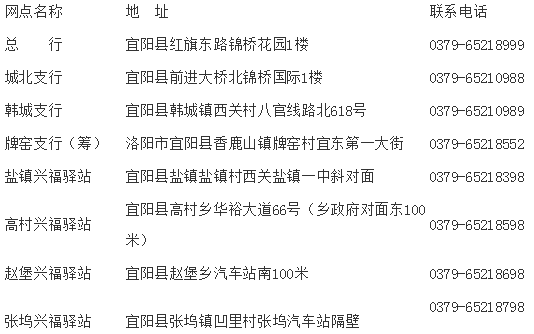 下載打印并填寫《宜陽興福村鎮銀行工作人員應聘報名表》,核對完整、無誤后送至以下報名點: