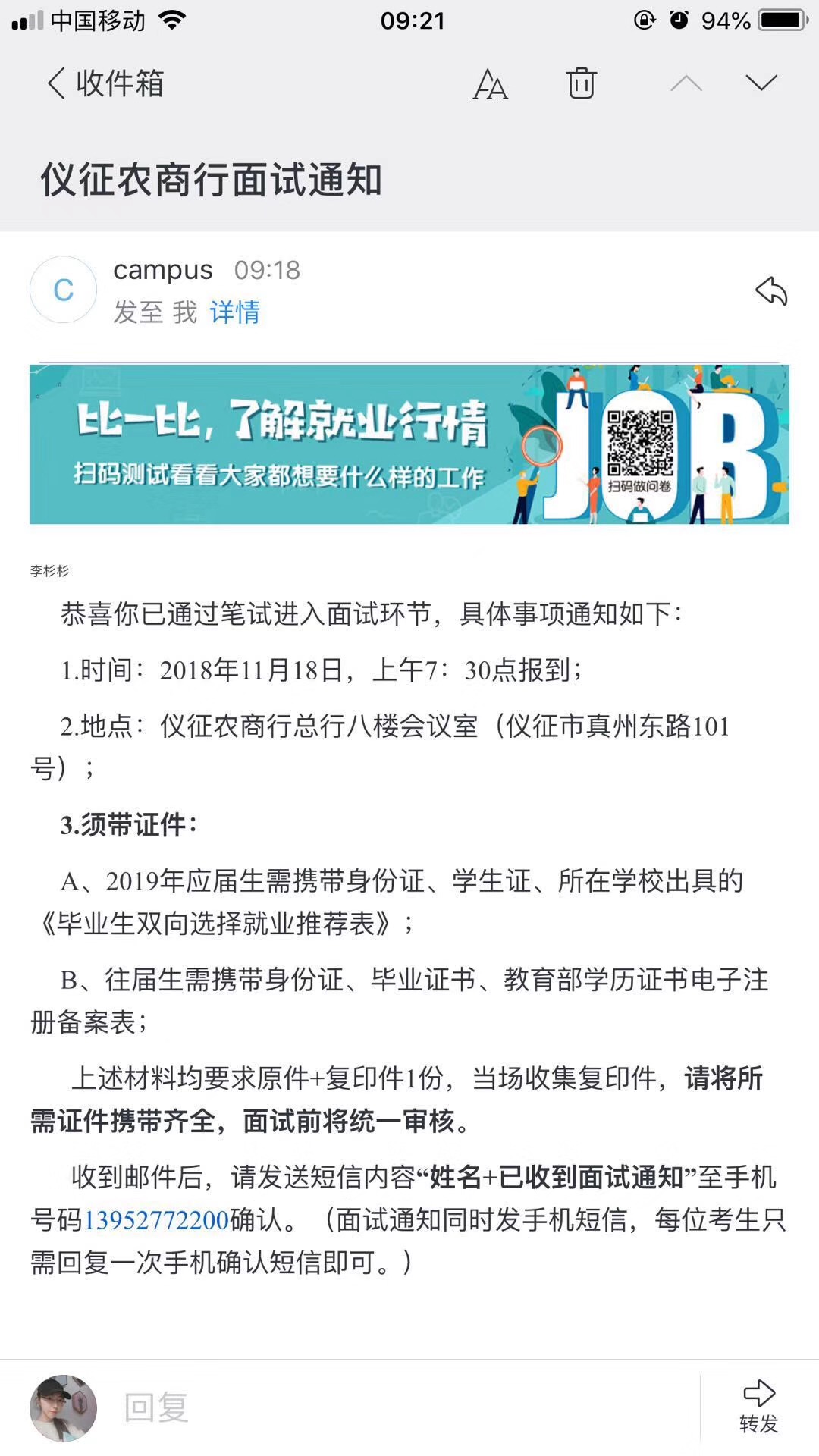 [江蘇]2019年儀征農商銀行校園招聘面試通知